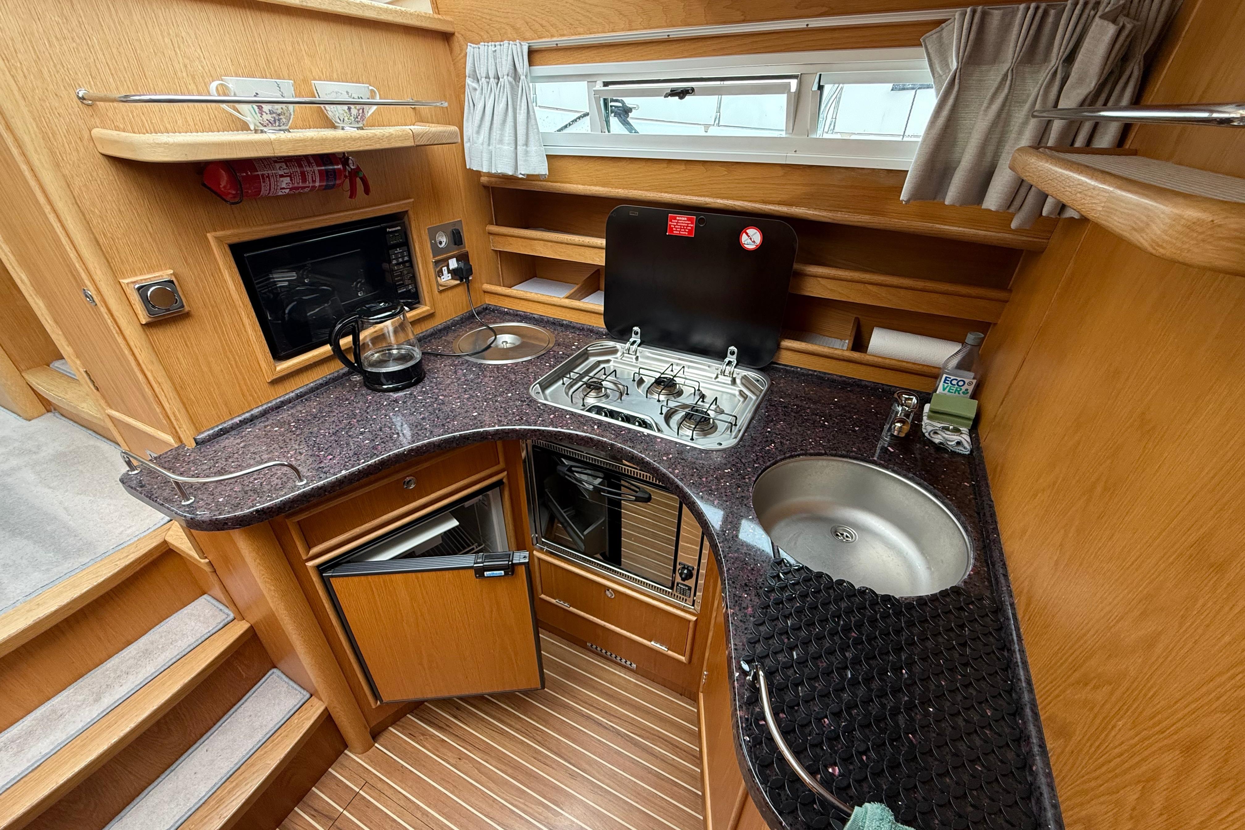 Well equipped galley with Avonite work surface, gas hob plus oven, microwave, and fridge as well as cool box in rear cockpit.