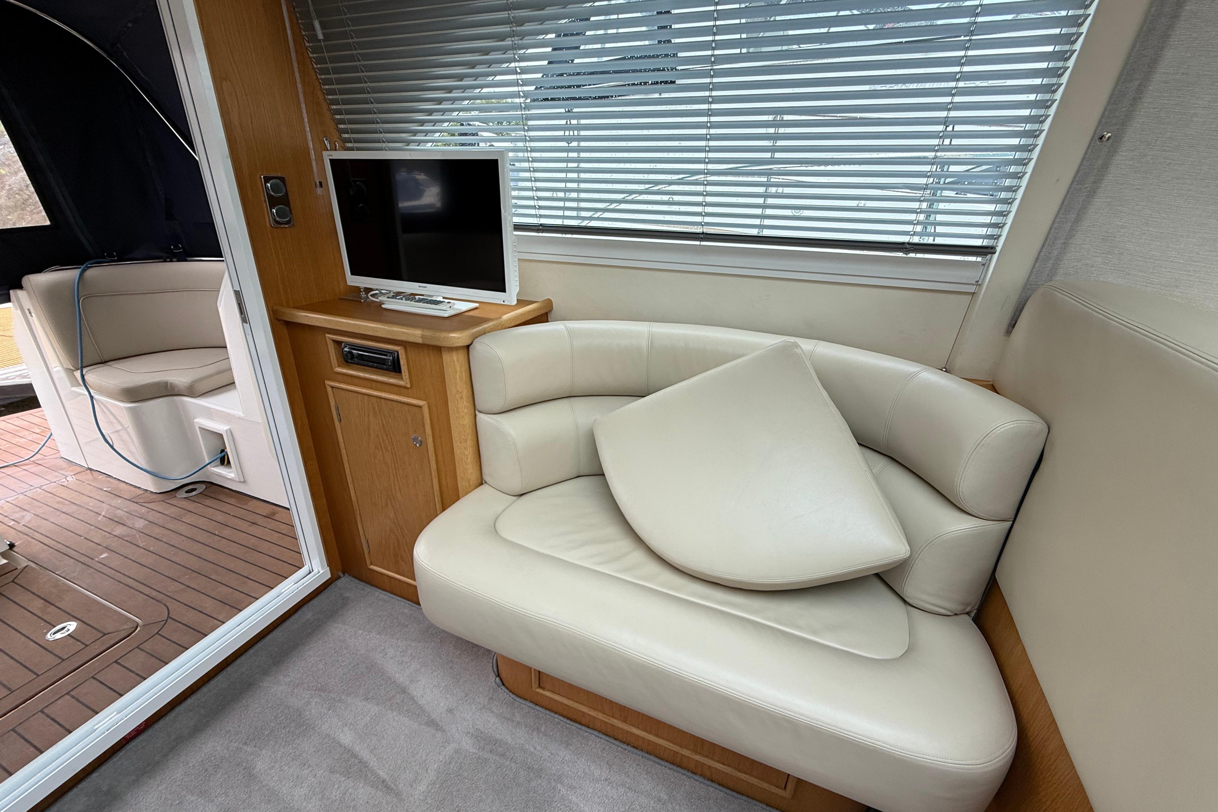 Spacious and well-appointed main cabin with large picture windows and full height sliding patio doors to the rear. Interior is elegant with wood, maintenance free, water and UV resistant, imitation leather seats, plus Alcantara style suede cream headlining.