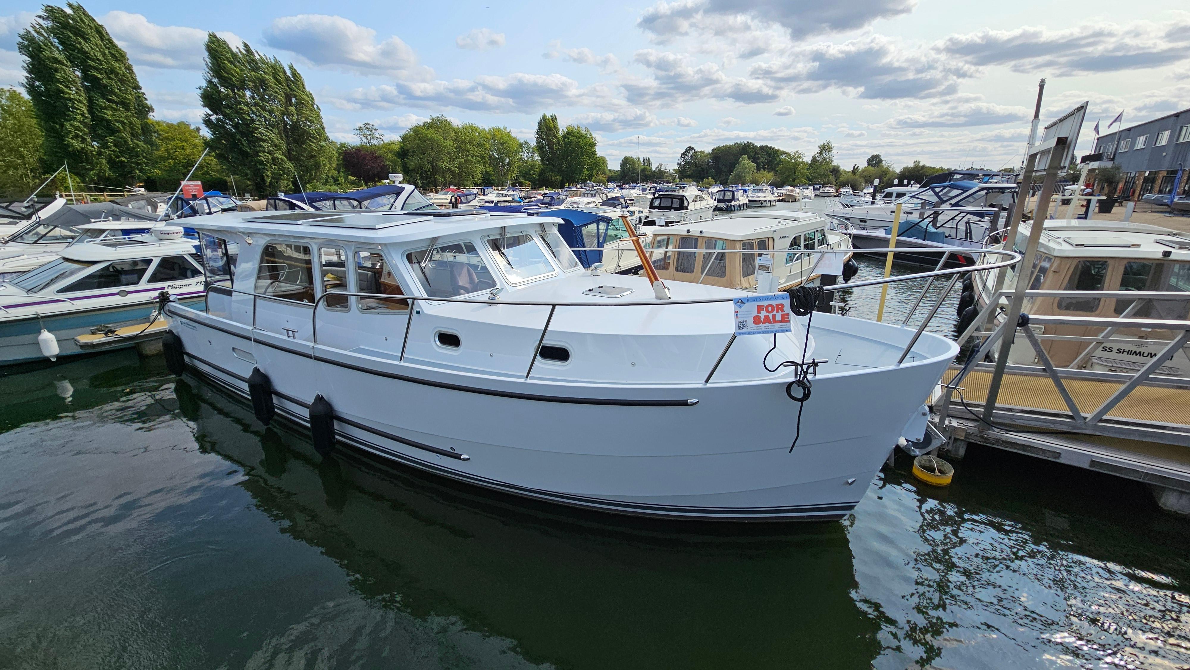 Featuring a steel hull with advanced insulation, the boat offers a sturdy and sleek exterior. It is equipped with a Vetus Deutz 2024 VD4140 inboard diesel engine delivering 140 horsepower, paired with advanced navigation and electric systems like Victron solar regulators and Panasonic PV panels. The interior is well-appointed with a convertible U-shaped seating area, a fully equipped galley, and a master bedroom. Additional features include stainless steel fittings, an electric sunroof, and extensive tankage for fuel, fresh water, and waste.